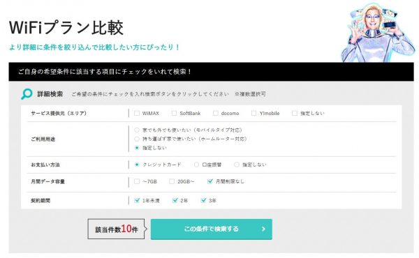 WiFiストアという比較サイトの検索機能がなかなか便利。データ量、支払い方法、契約期間で探せるんですね。